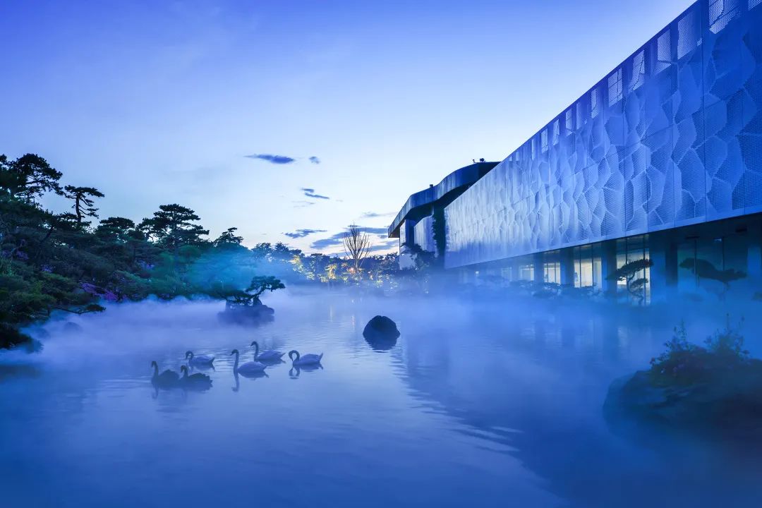 一座仙境般的摄影艺术馆建在园林之中,白天鹅、黑天鹅、锦鲤在水中嬉戏,繁花绿树,松柏常青,景色美不胜收。