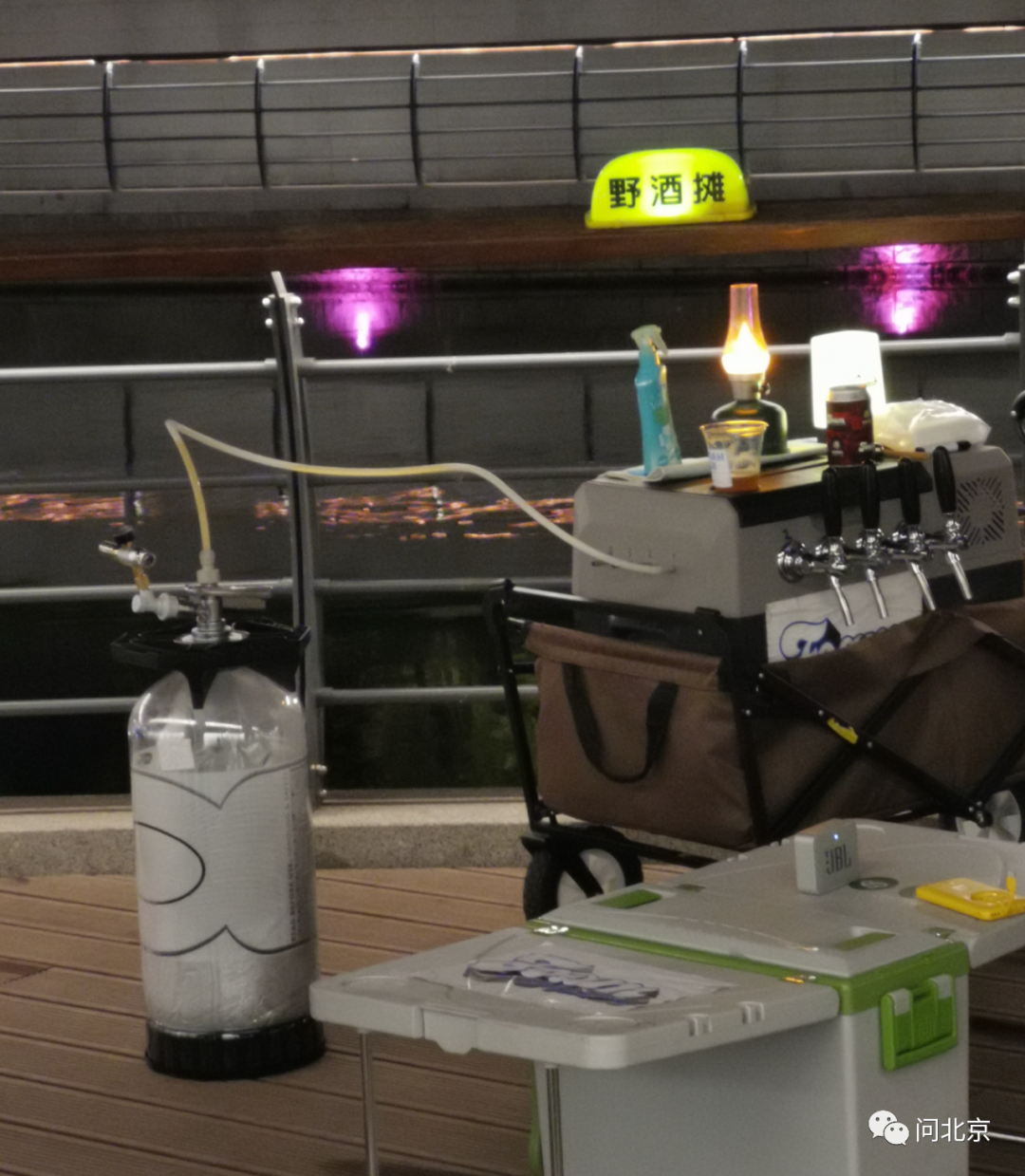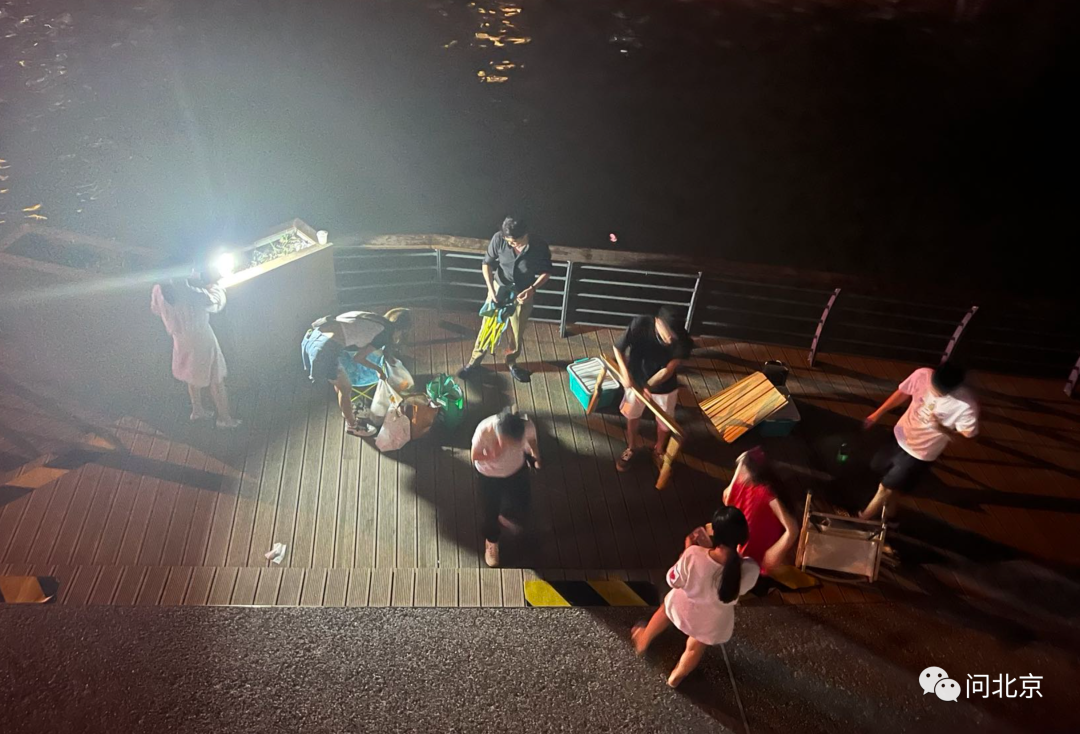 晚上10点,枣营北里31号楼门前的河畔景观灯带关闭,但是记者在现场看到,依旧有不少年轻人提着食品和酒水,带着照明灯和桌椅,来到河边准备开始聚会。经常在附近拉活的出租车司机刘师傅告诉记者: