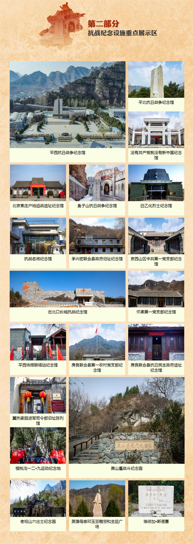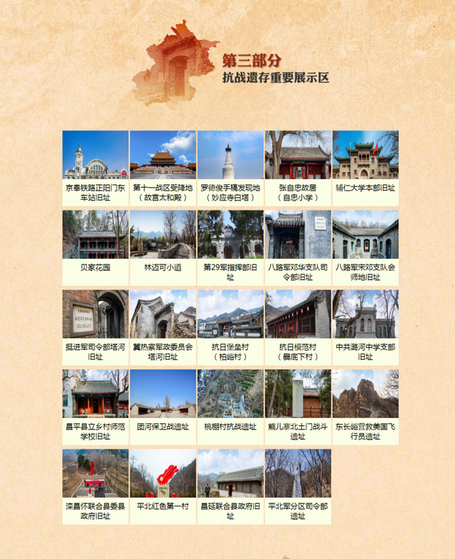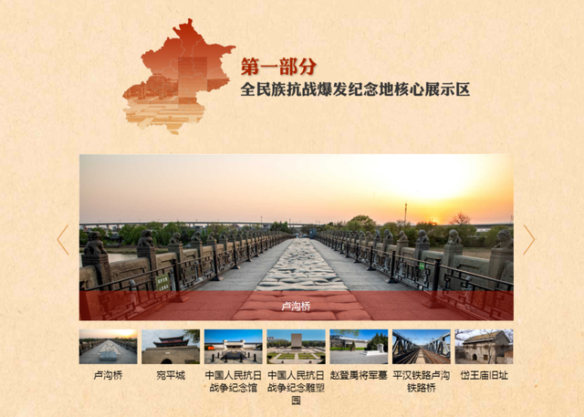 网络专题以北京市各区为基础,介绍各个区的重要抗战遗存和纪念设施160余处,展示了北京抗日战争主题片区重点纪念设施和遗址遗迹。