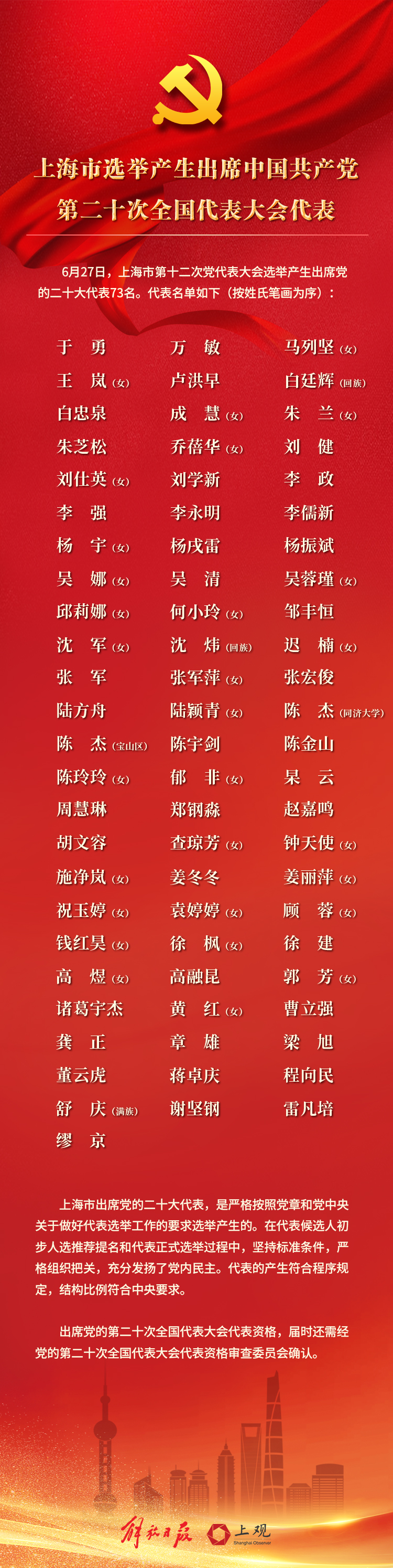 6月27日,上海市第十二次党代表大会选举产生出席党的二十大代表73名。