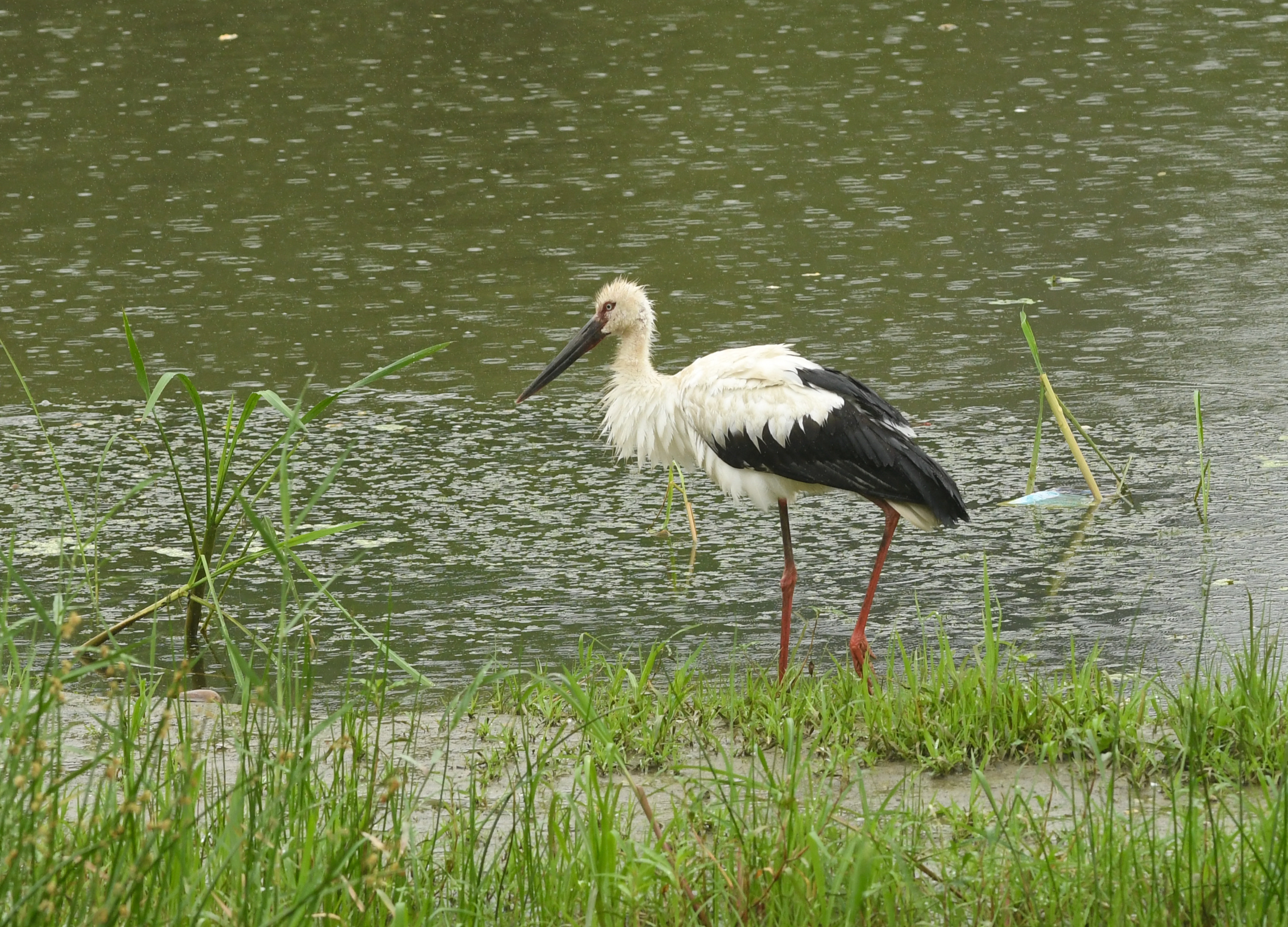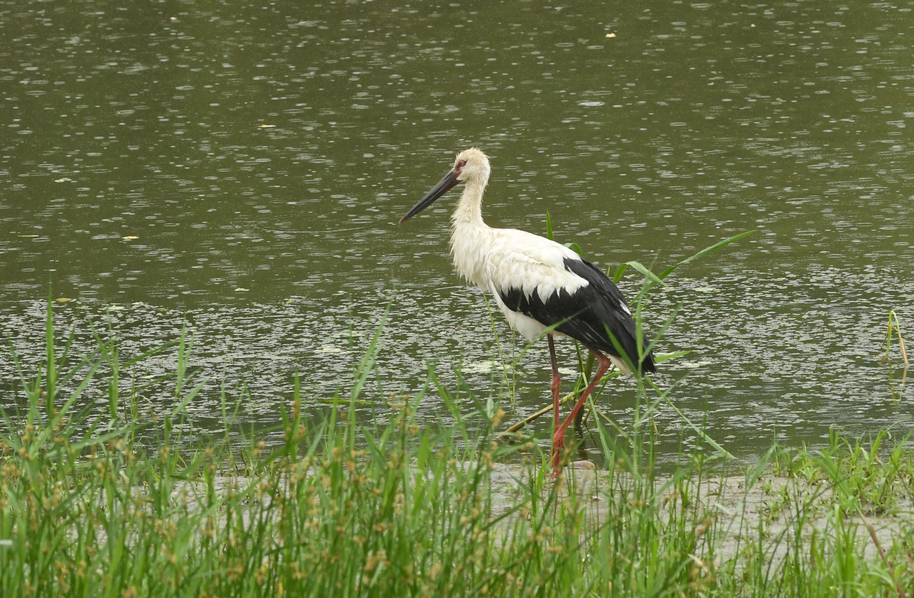 7月12日清晨,温榆河公园内清河、温榆河两河交汇处的“生态心”被降雨笼罩,白鹭、苍鹭、鸬鹚等鸟儿们正在戏水。其中,有一只白头、白颈、黑羽、黑喙的大鸟悠闲地踱步、觅食,这是温榆河公园迎来的又一位“重量级来宾”——东方白鹳。