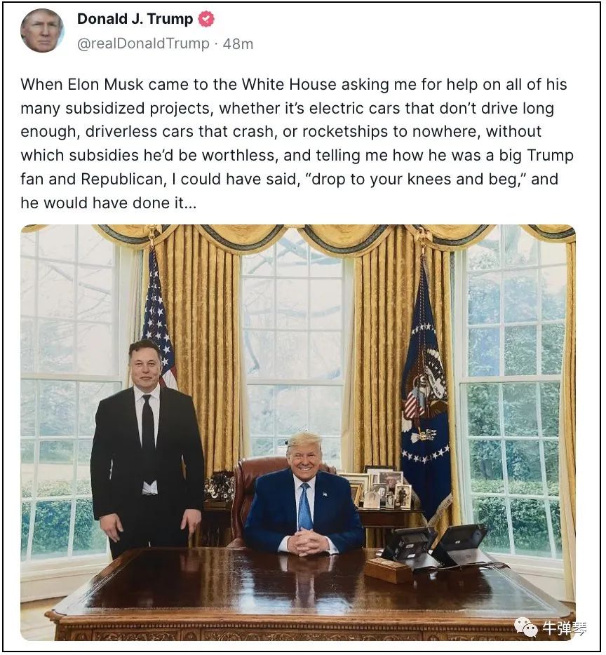 而且,特朗普还很用心地贴了一张照片,白宫椭圆形办公室,特朗普坐在老板椅上,马斯克就站在旁边,满脸是笑。