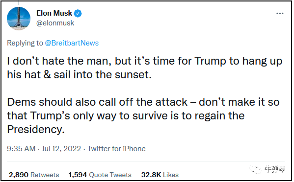 当然,我看到有美国人这样分析:特朗普以前是推特之王,虽然现在已经是一别两宽,但看到马斯克现在“调戏”推特,特朗普难免有点失落,“就像一个充满嫉妒的前任一样”……