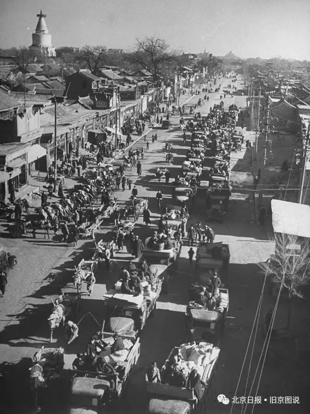 1946年,车水马龙的阜成门内大街。路中行驶的卡车上载着遣返的日本人。
