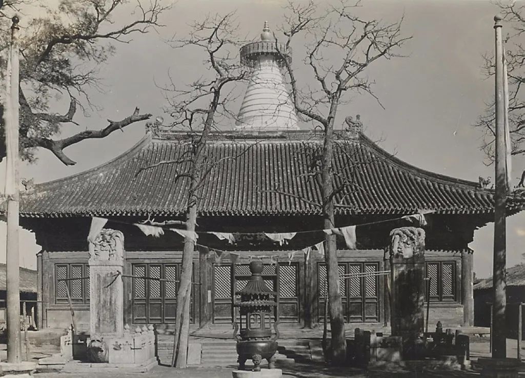 大觉宝殿又名三世佛殿,檐下的“意珠心境”匾额由乾隆御笔题写。殿前的两通康熙御制妙应寺碑已经不存。赫达·莫理循摄于1930年代。
