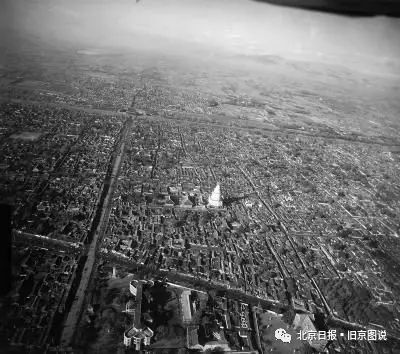 阜成门内一带,图中垂直方向的一条主干道为阜内大街,横向主干道为北沟沿,即现赵登禹路。位于照片中心的区域是今天的白塔寺,下方醒目的工字形建筑为成立于1918年的北京中央医院,现为北大人民医院。
