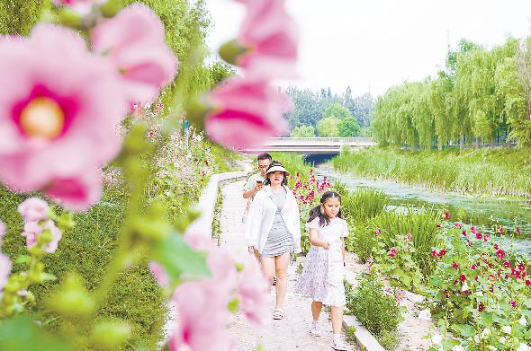 大兴高米店附近的河边步道,夏花缤纷,绿意盎然。
