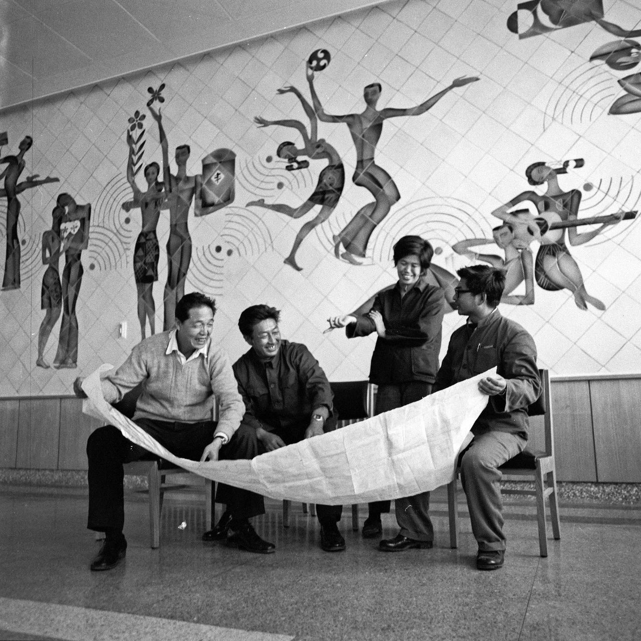 1979年秋 ,首都国际机场壁画《科学的春天》作者肖惠祥(左三)和工艺监制严尚德(左一)、张一芳(左二)、岳景融(左四)在一起讨论画稿。
