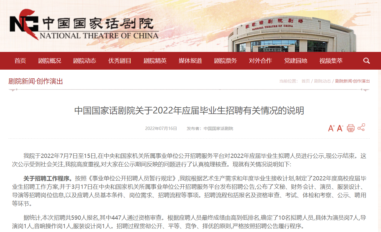 衷心感谢社会公众对中国国家话剧院长期以来的关心、关注和支持,我们珍惜每一位有志投身戏剧舞台的表演人才,也尊重每一位鼓励我们进步、鞭策我们前行的观众和各方人士。我们将以诚恳的态度面对大家的质疑,自觉接受社会监督,严格按照招聘程序,做好后续相关工作。