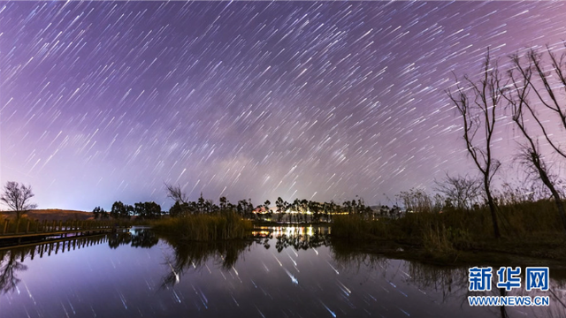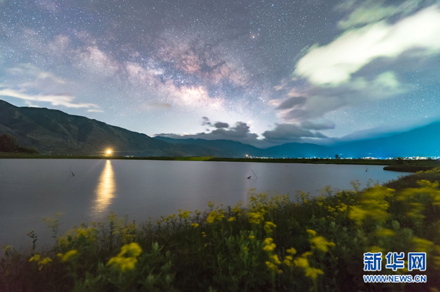 昆明南滇池国家湿地公园,星空与湖水相映(视频截图)。新华网发(晋宁区融媒体中心 供)