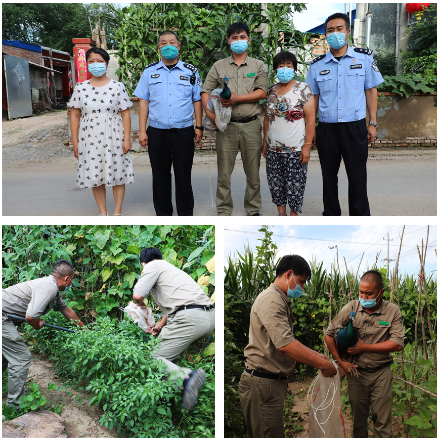 接到报警后,榆垡镇派出所民警联络野生动物园工作人员立即驱车赶到现场。曹辛庄村60多岁姚大妈说,下午五点钟左右,她发现家门口小菜园里来了一只孔雀,考虑到这种鸟是国家保护动物,于是叫上家人一起在小菜园的地上撒上了食物,然后用手机拨打了110报警。