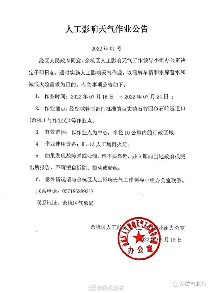 昨日,余杭区人工影响天气工作领导小组办公室发布公告,7月16日至7月24日,我区将在百丈镇石竹园鱼石岭隧道口等地实施作业。