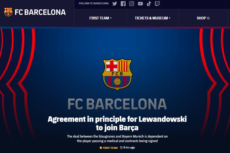 巴萨官网发布公告称,已经与拜仁慕尼黑足球俱乐部就莱万的转会达成原则性协议,球员将在通过体检后完成合同签订,最终加盟球队。