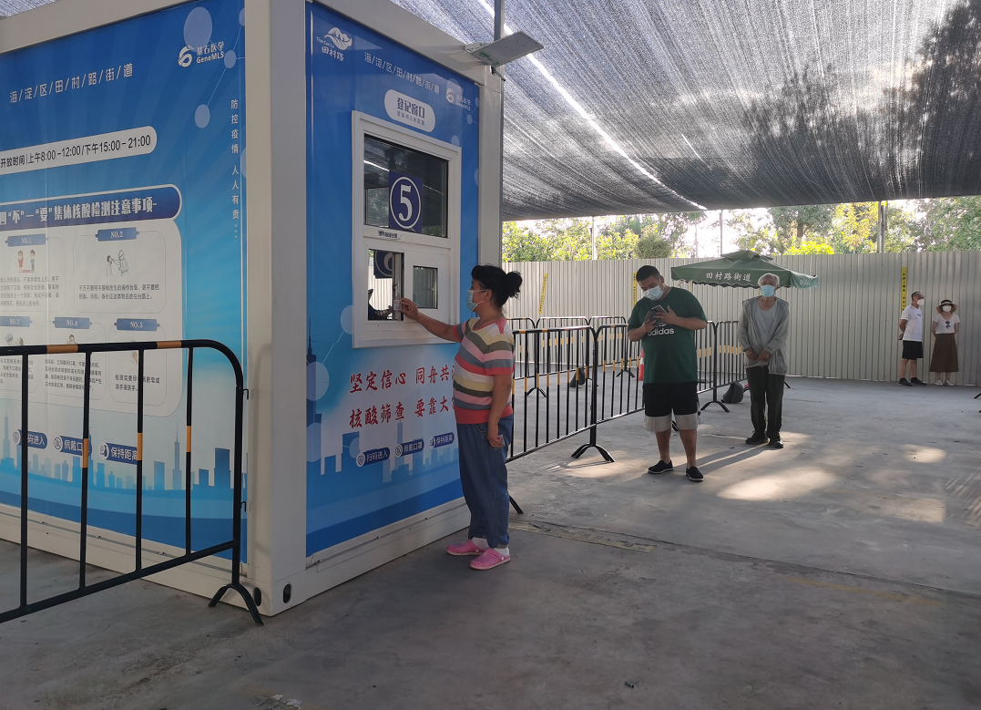 7月17日是入伏的第二天,北京骄阳似火,戴着N95口罩、身穿防护服的“大白”们仍坚守岗位忙碌,忍受着高温天气的“烤”验。为了保障“大白”们能够享受一丝清凉,海淀区田村路街道山南路核酸检测点空调、冷饮、防晒网齐上阵,为酷暑开出“凉”方。