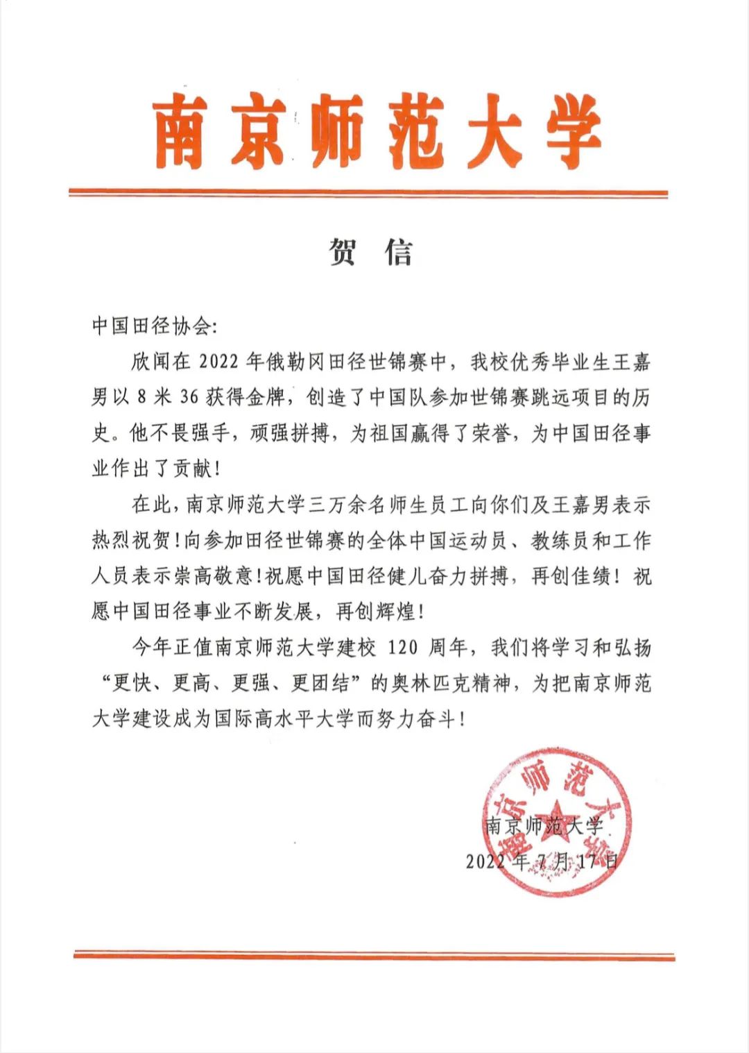 王嘉男是南京师范大学体科院2018届毕业生。作为高水平运动员,他刻苦训练,在赛场上接连打破各种纪录,在众多国内外重大赛事上取得佳绩。在南师大求学期间,他在刻苦训练之余积极与任课教师沟通,经常和同学们交流田径技巧和感悟,努力将体育基础理论与训练实际结合起来,做到“学以致用”和“用以促学”相结合。在老师和同学眼中,王嘉男脸上总是带着笑容,是一个积极、乐观的大男孩。