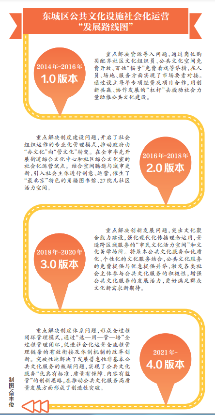 系统谋划、整体推进,落实政府保障责任、强化政策环境营造,形成全过程闭环管理模式、整合用好公共文化服务资源,突破性地解决了发展普惠性非基本公共文化服务的瓶颈问题……东城区将近年来在开展公共文化设施社会化运营实践中探索、创造的成功经验,上升为可操作、可复制、可推广的《全过程管理办法》,涵盖诸多具有普遍借鉴推广意义的创新举措。未来,东城区在推进全国文化中心建设的大局下,将继续紧扣创新融合主线,不断优化公共文化设施网络、改革公共文化服务体制机制、完善服务体系和政策环境,推进公共文化服务体系建设更高质量发展,为全国公共文化服务体系建设提供“东城方案”、贡献“东城经验”。