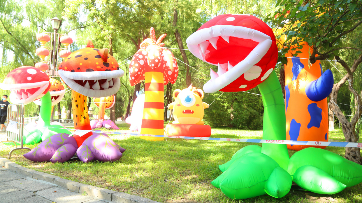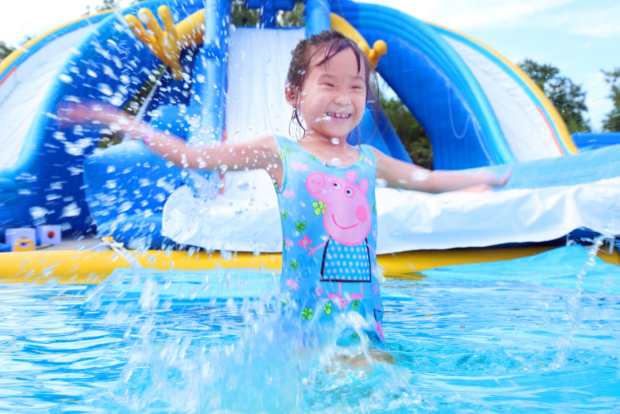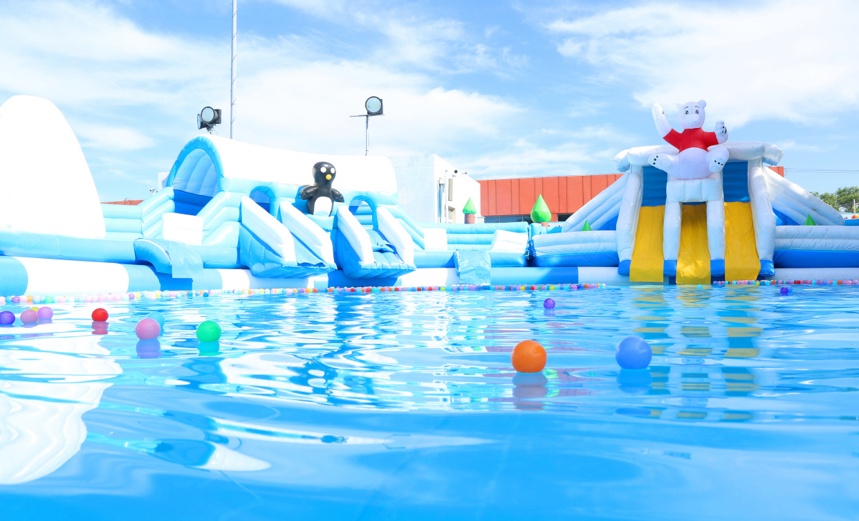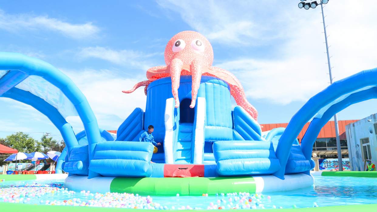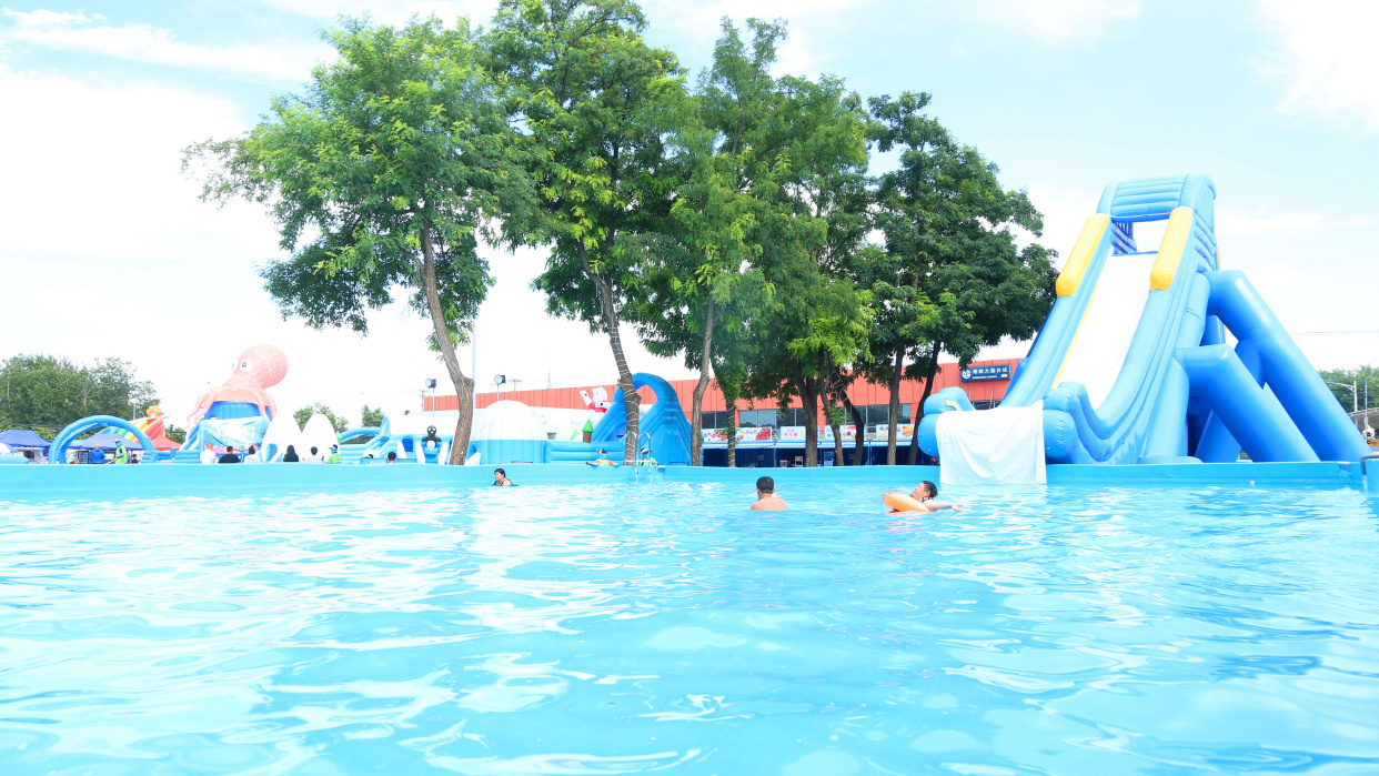 7月18日下午3点多,记者来到北京世界公园,从公园南门进入,只见大门右手边原来的冰雪嘉年华现在已经变身成为戏水乐园,一个个充气卡通造型的戏水游乐项目可爱爆表,水面上漂浮着五颜六色的海洋球,不时有小朋友或是从海洋球中探出萌萌的小脑袋,或是从高高的滑梯上飞流直下,或是尽情拍打着水花,或是晃晃悠悠闯过一道道关卡......整个区域就是一片欢乐戏水嘉年华。