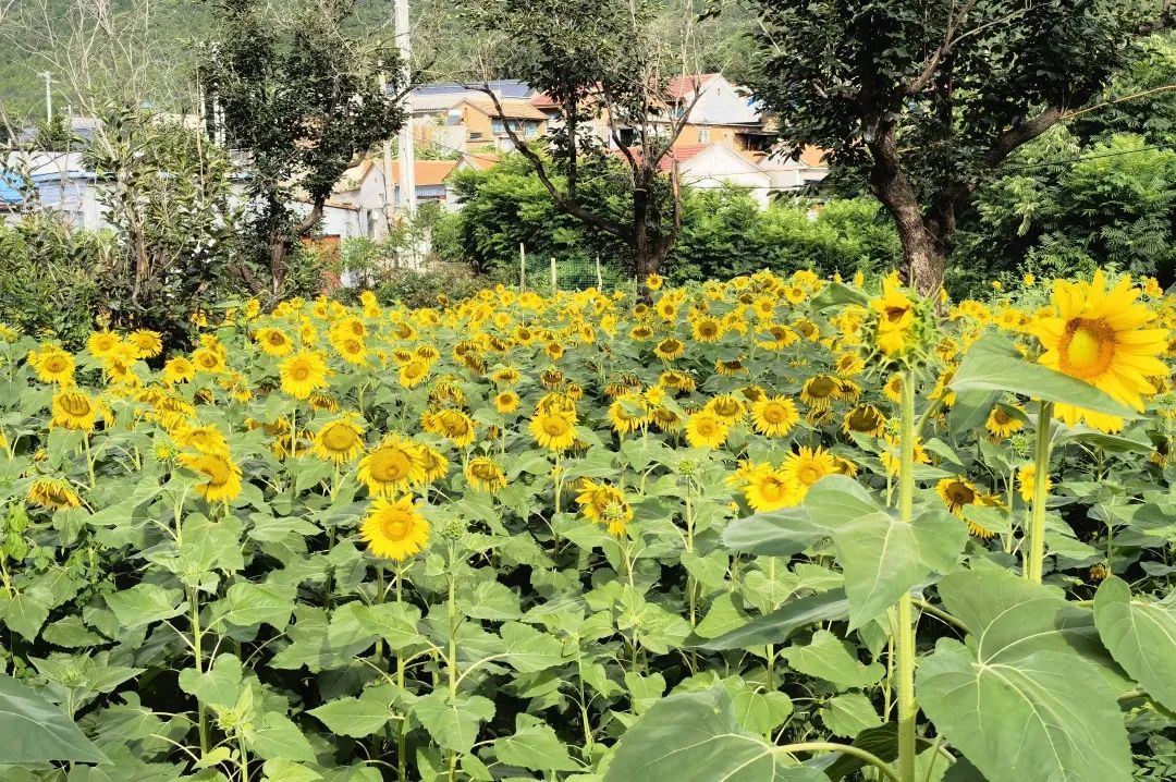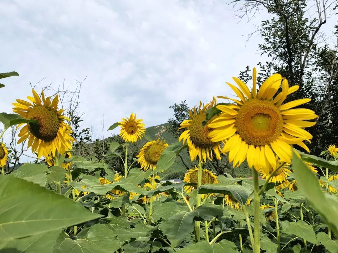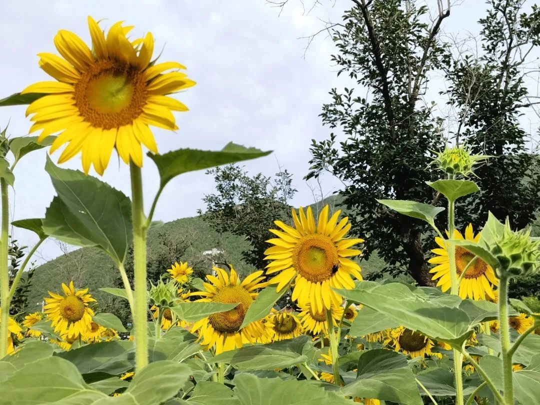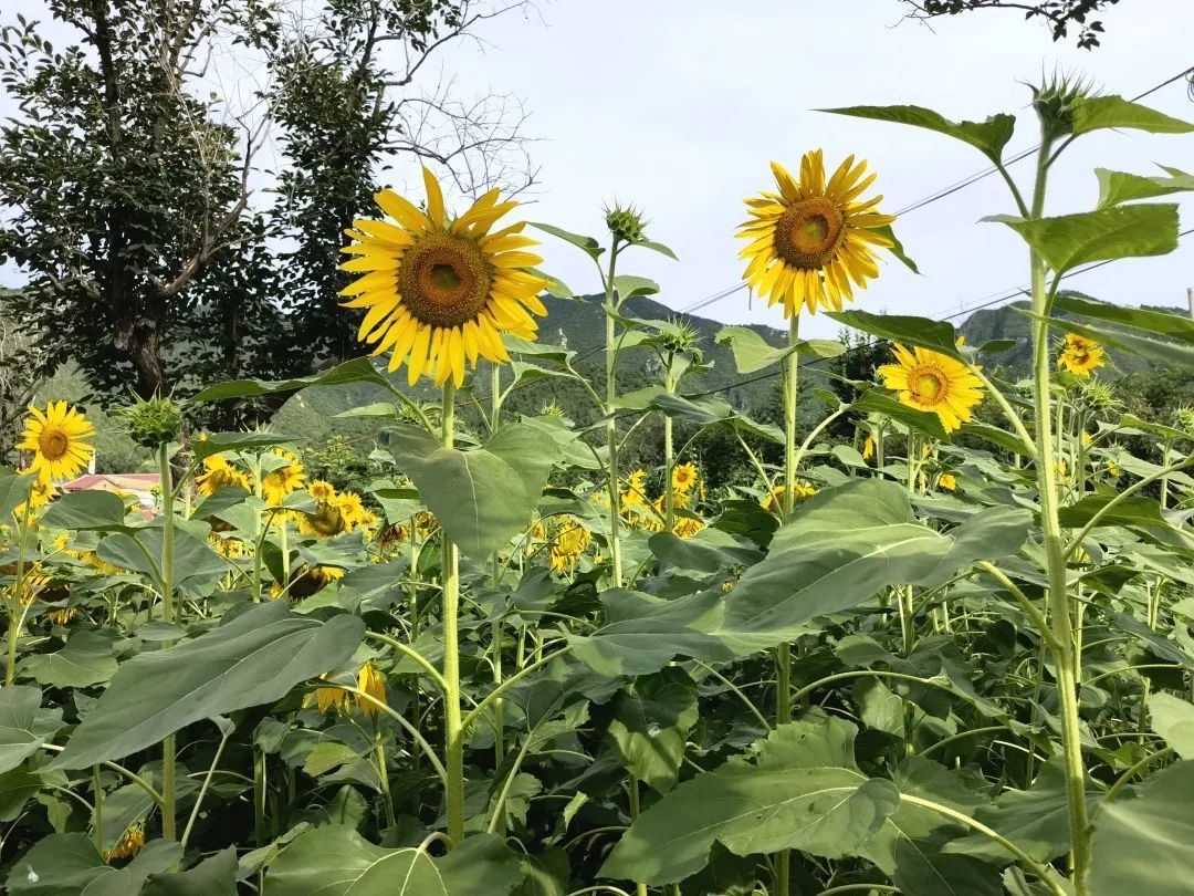 在泰陵园村西一处地块上,高大的向日葵全部绽放。金黄色的花朵,迎着太阳绽放出张张灿烂的笑脸,部分向日葵由于花心结满了饱满的种子,而谦虚地低下了头。