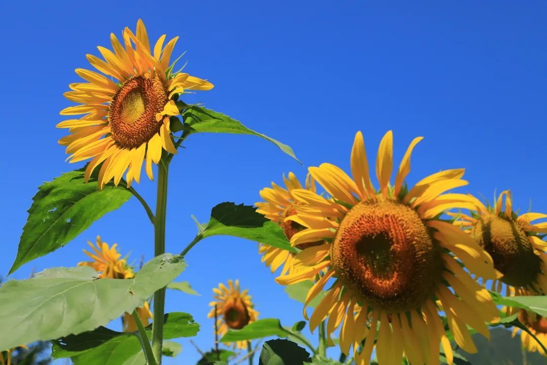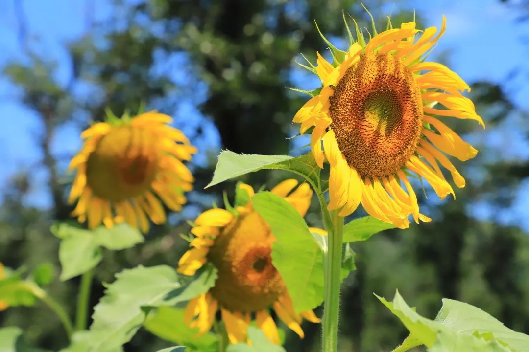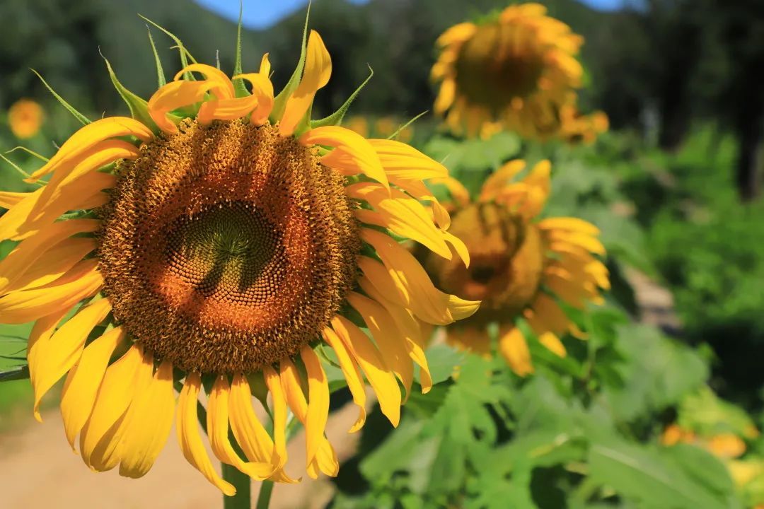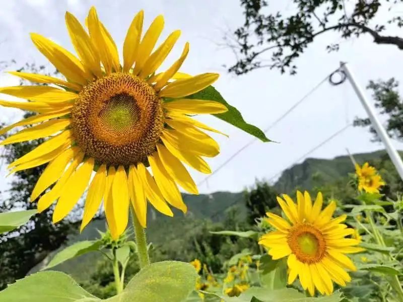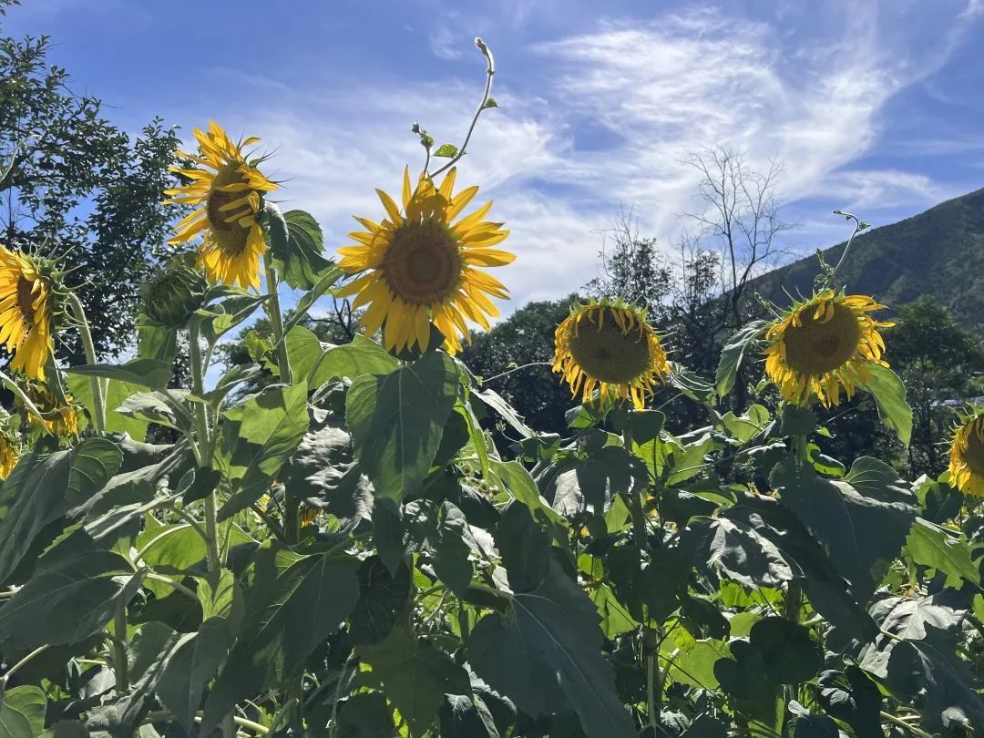 在泰陵园村西一处地块上,高大的向日葵全部绽放。金黄色的花朵,迎着太阳绽放出张张灿烂的笑脸,部分向日葵由于花心结满了饱满的种子,而谦虚地低下了头。