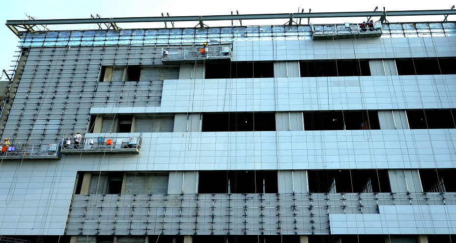 随着上周六入伏,北京正式开启“桑拿天”模式。在安贞医院通州院区十余万平方米的外幕墙施工现场,抬眼望去,和陈建星一样的“蜘蛛人”还有很多。他们坚守在自己的岗位上迎战高温,紧张忙碌,保证施工进度。