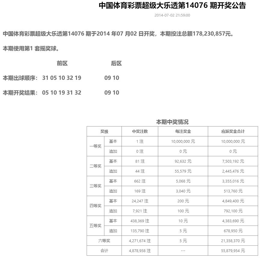 2014年7月2日第14076期开奖公告截图