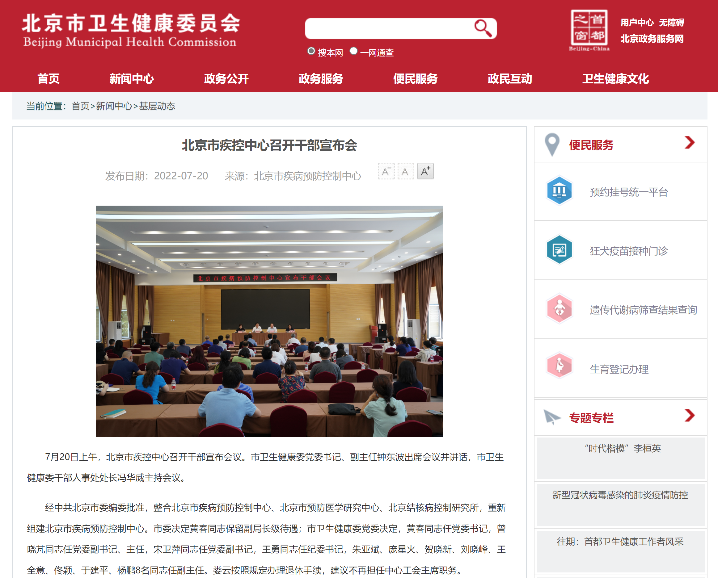 北京市卫健委官网今天发布消息,经中共北京市委编委批准,整合北京市疾病预防控制中心、北京市预防医学研究中心、北京结核病控制研究所,重新组建北京市疾病预防控制中心。