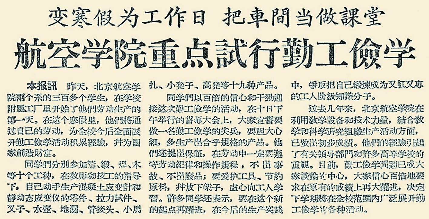 据北京日报1958年2月12日6版《航空学院重点试行勤工俭学》报道,北京航空学院两个系的300多名学生利用寒假到学校附属工厂参加劳动,涉及铸、锻、焊、木等10个工种。在教师和技工的指导下,学生们自己动手生产混凝土应变计和静动态应变仪的零件,以及拉力试件、叉子、水壶、地漏、管接头、小马扎、小凳子、高凳等几十种产品。这次勤工俭学为期一周左右,学生们创造出的产值达1.64万元,其中纯收入约5000多元。