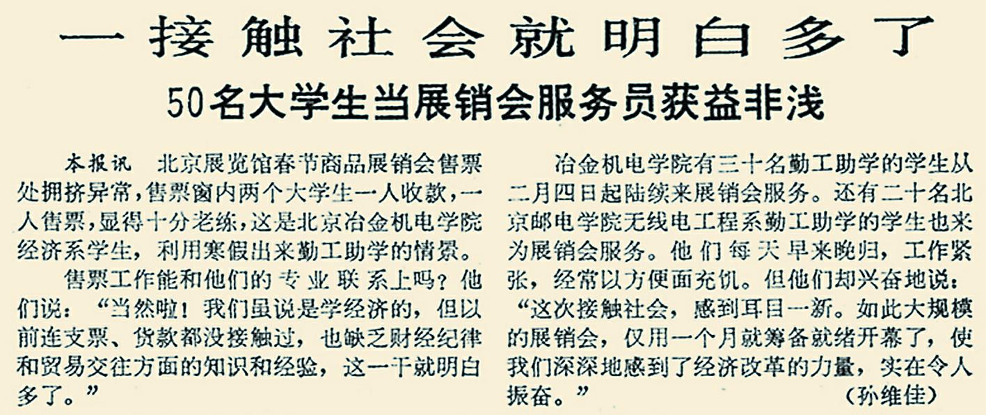 1985年,北京冶金机电学院经济系50名大学生利用寒假参加了北京展览馆春节商品展销活动,负责收款、售票等服务。“我是学经济的,但以前连支票、货款都没接触过,也缺乏财经纪律和贸易交往方面的知识和经验。”一位同学表示,“这一干就明白多了。”(1985年2月24日《北京日报》1版,《一接触社会就明白多了》)
