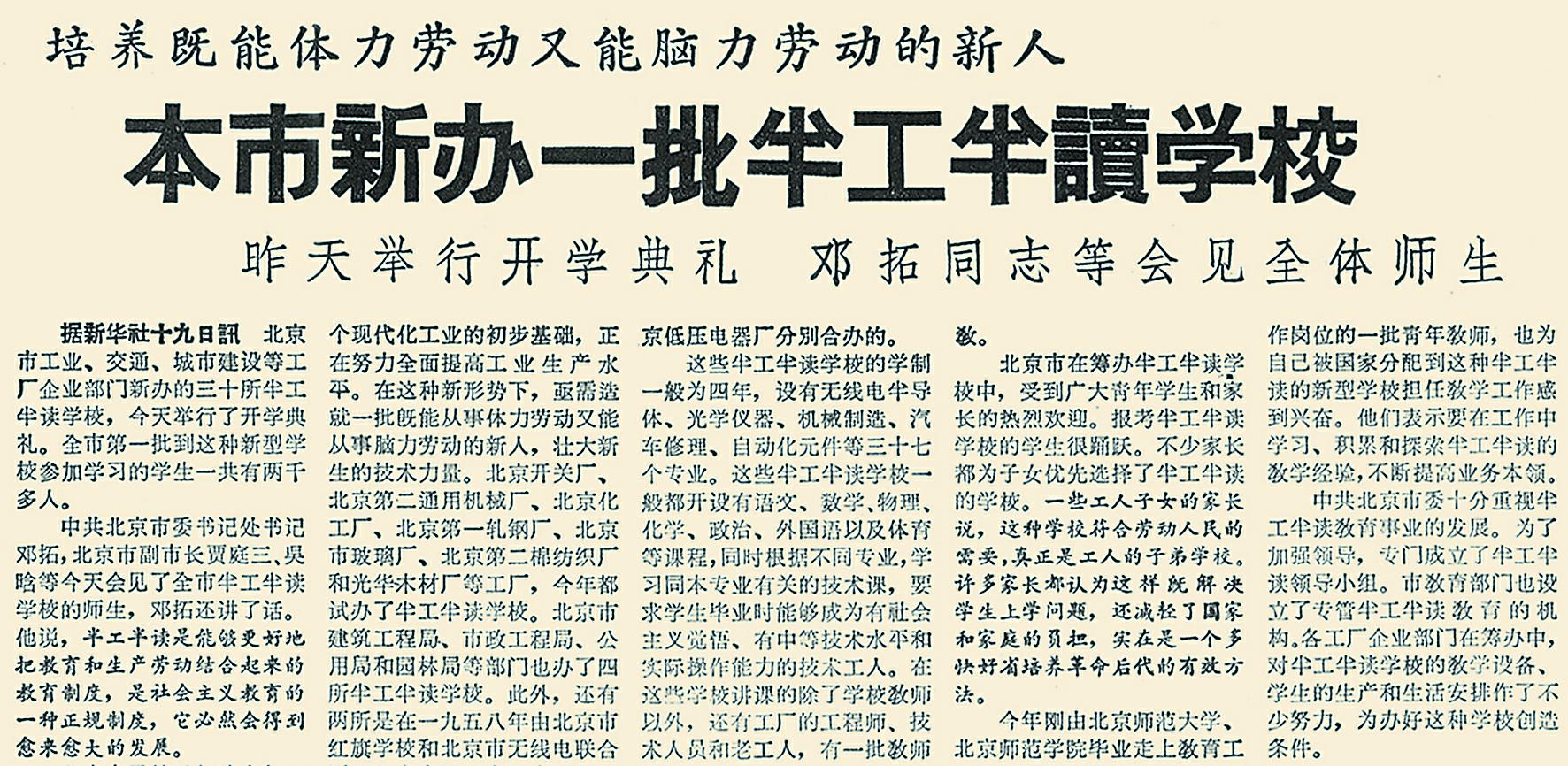 据北京日报1964年9月20日2版《本市新办一批半工半读学校》记载,当时的北京已经建立起现代化工业的初步基础,正努力全面提高工业生产水平。在这种形势下,亟须造就一批既能从事体力劳动又能从事脑力劳动的人才,壮大技术力量。为此,北京开关厂、北京第二通用机械厂、北京化工厂、北京市建筑工程局等工厂和部门试办了半工半读学校。这些学校学制为4年,设有无线电半导体、光学仪器、机械制造、汽车修理、自动化元件等37个专业,同时开设语文、数学、物理、化学、政治、外国语以及体育等课程,学生在各自专业学习技术课,毕业时能够成为有中等技术水平和实际操作能力的技术工人。