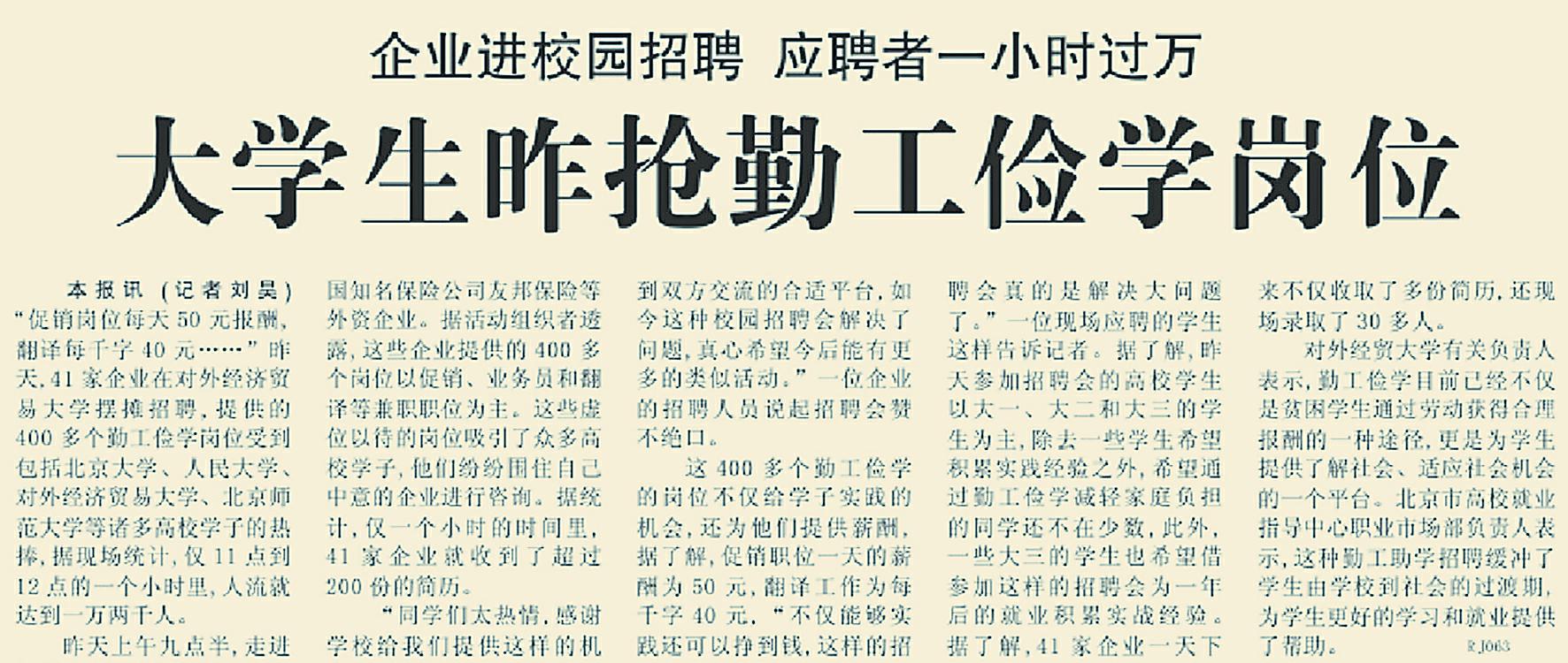 再后来,北京有了不同部门主办的各种招聘会,企业进校园现场摆摊,为大学生提供多种勤工俭学岗位。2005年,在对外经贸大学举办的一场招聘会上,41家企业提供了400多个勤工俭学岗位,仅仅1个小时便有1.2万名大学生前去应聘,火热程度可见一斑。(2005年5月20日《北京日报》7版,《大学生昨抢勤工俭学岗位》)