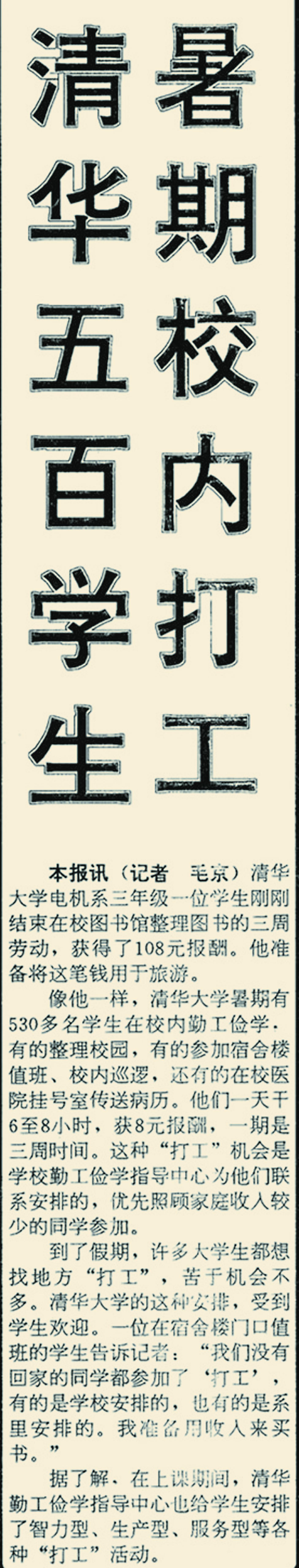 1992年暑假,清华大学勤工俭学指导中心为530多名学生提供了校内勤工俭学的机会。有的学生负责整理校园,有的学生参加宿舍楼值班、校内巡逻,还有的学生在校医院挂号室传送病历。他们每天干6至8小时,获8元报酬,一期是三周时间,家境困难的学生可以优先参加。(1992年7月28日《北京日报》6版,《清华五百学生暑期校内打工》)