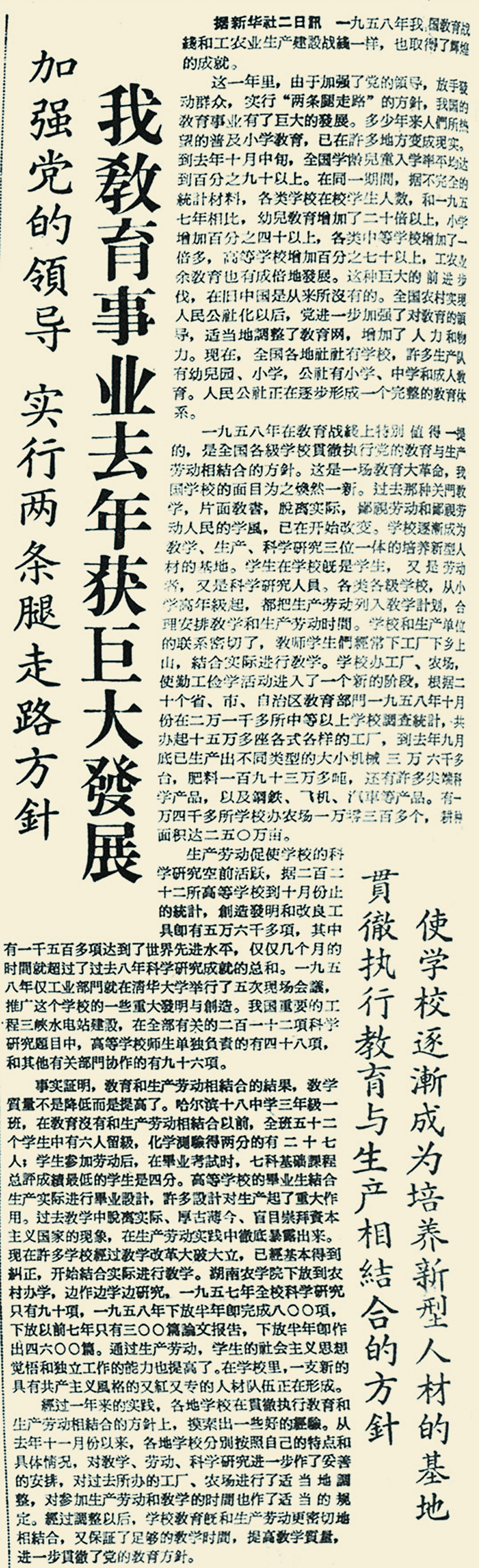 不仅如此,高校的勤工俭学活动还取得了一大批劳动成果,为国家创造出大量财富。北京工业学院研制出了我国第一个脉冲转速表,价格比进口产品便宜一半以上,使用寿命也长,指数准确;清华大学研制出了电子扩大器,外形灵巧,便于携带,质量指标中的稳定性、放大倍数超过了进口产品的水平;北京农业机械化学院研制出了自动中耕锄草化学施肥机,可以在高粱、玉米等高秆作物地里同时进行中耕、除草,并能自动施肥,工作效率大大提高。(1958年7月9日《北京日报》2版,《又是学生又是工人》)