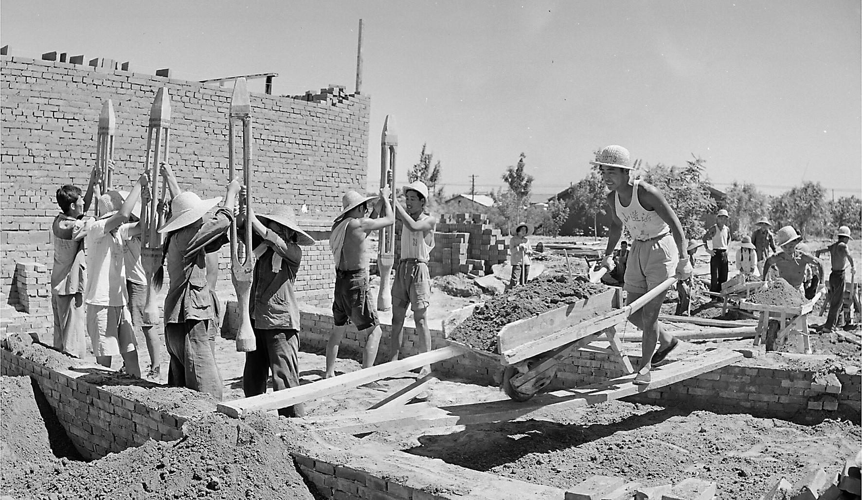 1958年,北京市土木建筑工程学校师生参加勤工俭学活动。图为他们在修建教学楼。冯文冈/摄