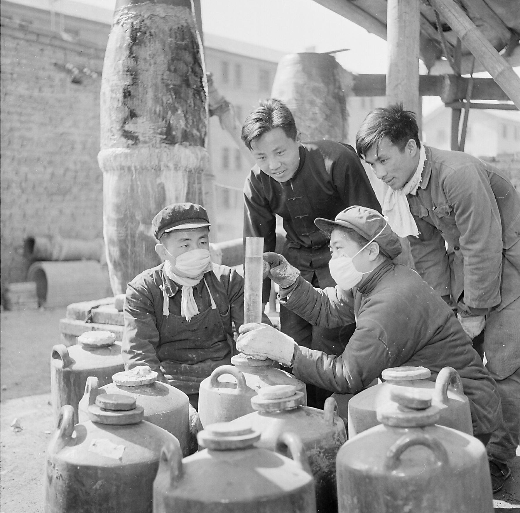 1959年,北京市化工学院的师生参加勤工俭学活动。图为他们在盐酸厂测盐酸浓度。冯文冈/摄