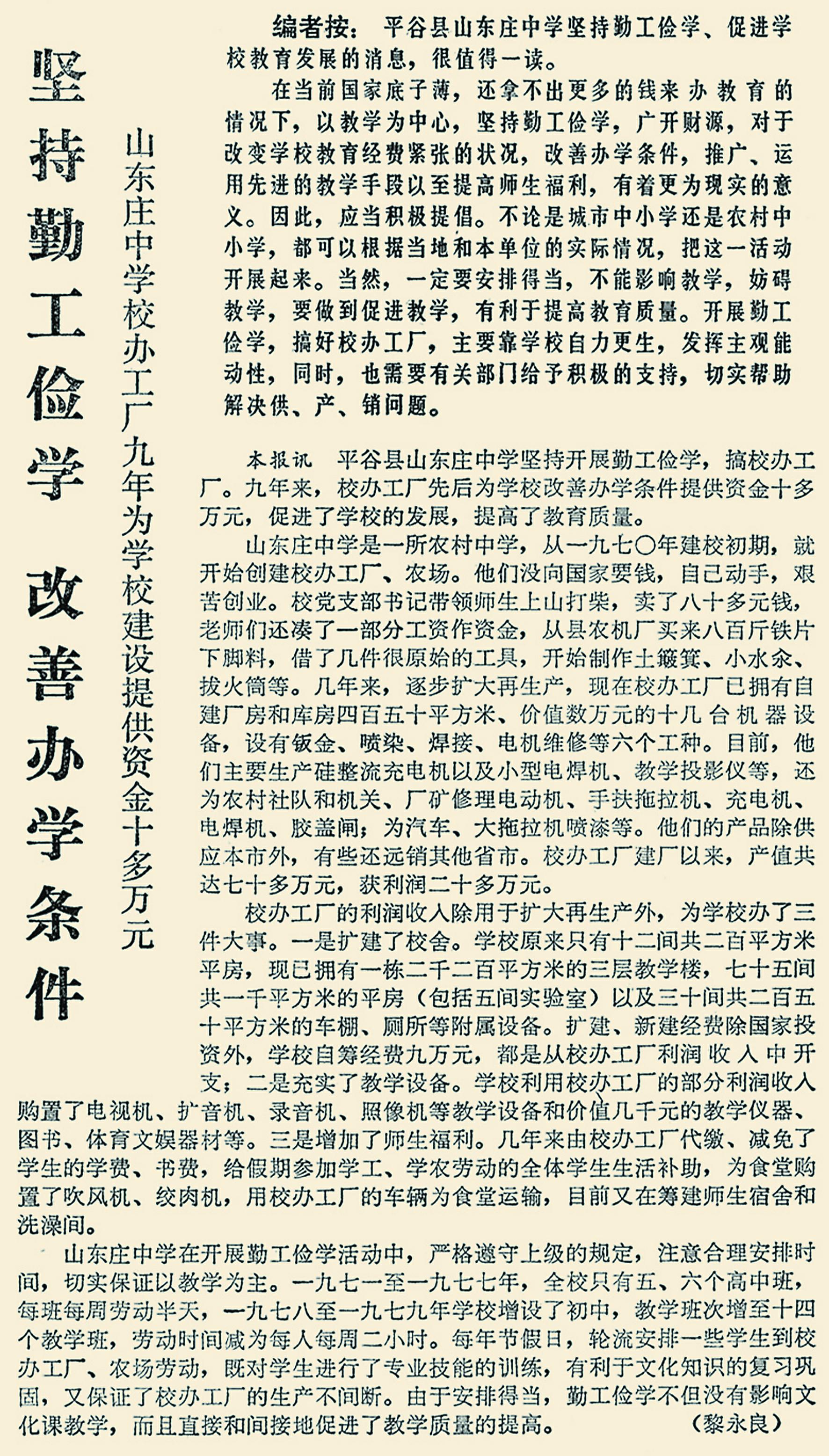 北京日报1980年3月4日2版报道《坚持勤工俭学改善办学条件》记录了平谷山东庄中学的做法:这所农村学校从建校之初就创办了工厂、农场,全校师生参与勤工俭学。1971年至1977年,全校只有五六个高中班,每班每周劳动半天。1978年至1979年,学校增设了初中,教学班增至14个,劳动时间减为每人每周两小时。到1980年,这所学校的校办工厂已拥有自建厂房和库房450平方米、价值数万元的机器设备,可以生产硅整流充电机以及小型电焊机、教学投影仪,还能修理充电机、电焊机,为汽车、大拖拉机喷漆,所获利润达20多万元。用这笔钱,学校扩建了校舍,增添了教学设备,甚至减免了学生的学费、书费。
