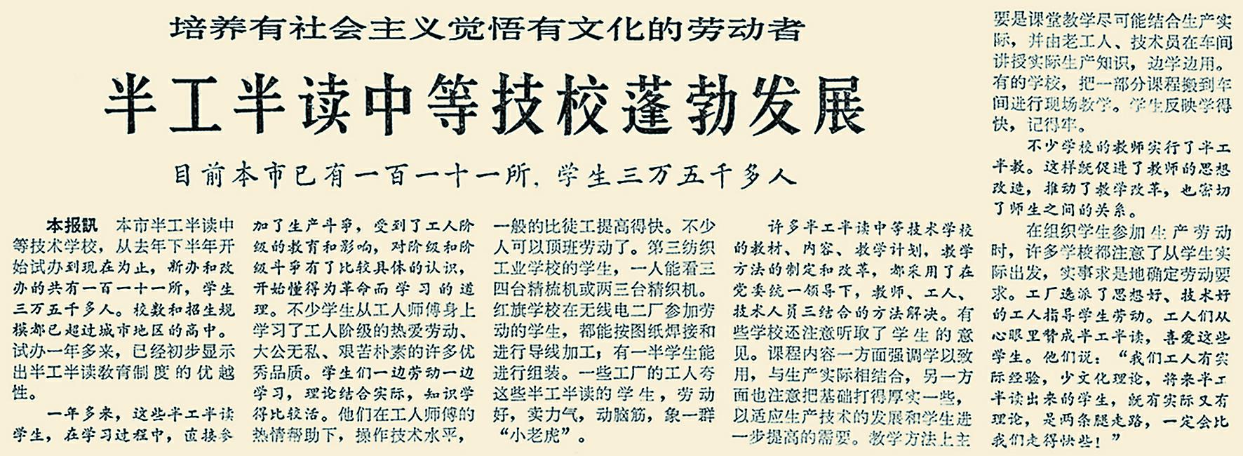 截至1965年底,北京的半工半读学校有111所,专业涉及机械、无线电、冶金、化工、纺织、轻工、邮电、交通、建筑、建材、物资、财贸等各行各业。半工半读学校的学生有3.5万多人,他们一边劳动一边学习,理论结合实际,知识学得比较活,操作技术水平也比徒工提高得快,很快就能顶班劳动。像第三纺织工业学校的学生,一人能看三四台精梳机或两三台精织机;红旗学校在无线电二厂参加劳动的学生,不但都能按图纸焊接和进行导线加工,还有不少学生可以完成组装。工人们打心眼儿里喜欢这些半工半读学校的学生,他们说:“我们工人有实际经验,少文化理论,半工半读出来的学生,既有实际又有理论,是两条腿走路,比我们走得快!”(1965年12月31日《北京日报》5版,《半工半读中等技校蓬勃发展》)
