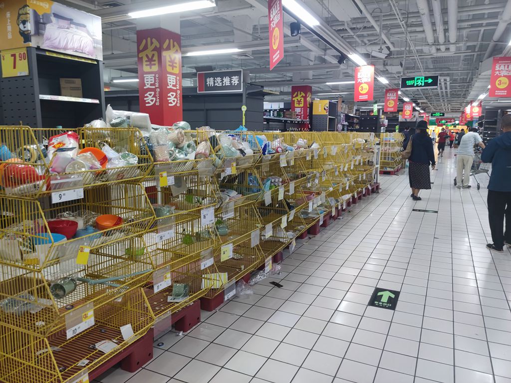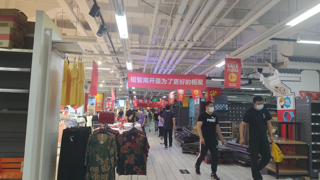 家乐福方庄店要升级改造的消息在附近居民中已经传了一阵儿。一进超市,蔬菜、水果、熟食、干货、肉类等大部分货架上的商品都已被抢购一空。“户外马甲原价69元,现价20元。”“夹克原来卖398元,现在只卖99了。都是成本价。”负一层最热闹的当属售卖衣服、鞋、包、床上用品的区域了。