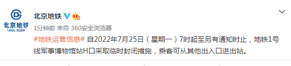 自2022年7月25日(星期一)7时起至另有通知时止,地铁1号线军事博物馆站H口采取临时封闭措施,乘客可从其他出入口进出站。