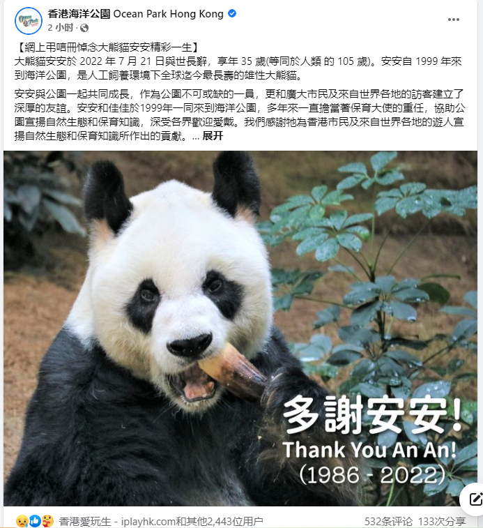 据香港海洋公园21日消息,大熊猫“安安”当天早晨离世,享年35岁,等同于人类105岁高龄,是全球人类照顾下最长寿的雄性大熊猫。