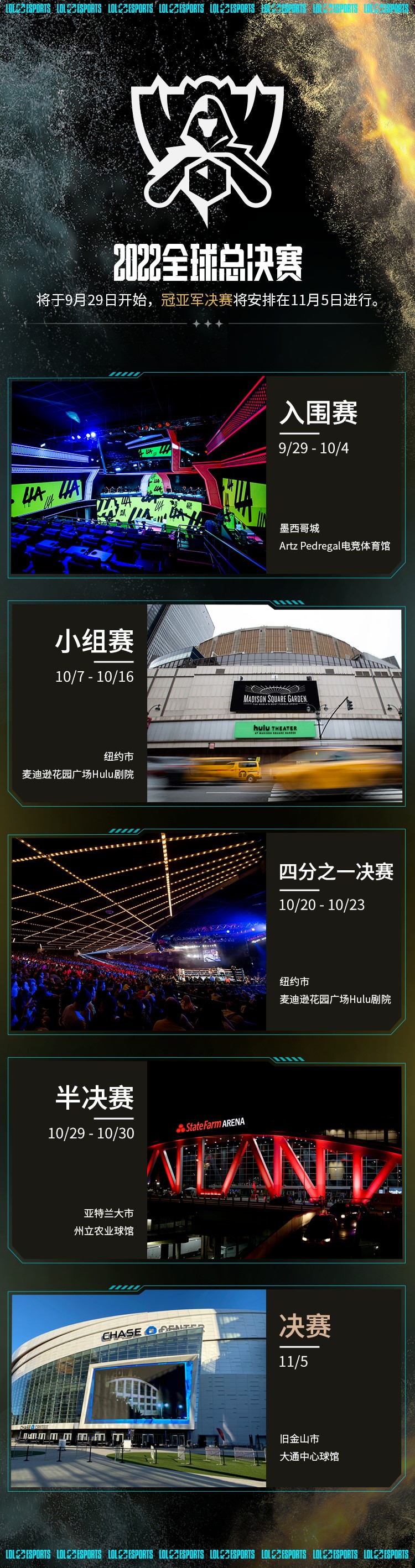 7月21日,电子竞技赛事英雄联盟主办方宣布,2022年全球总决赛(S12)的决赛日期为11月5日,决赛地点为美国加利福尼亚州旧金山市大通中心球馆。