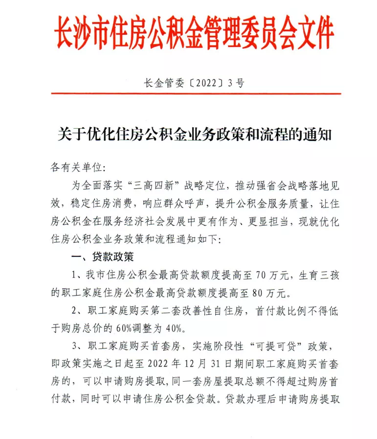 7月22日,长沙市住房公积金管理委员会今日发布《关于优化住房公积金业务政策和流程的通知》(以下简称《通知》),将长沙市住房公积金贷款的最高额度从60万元提高至70万元,生育三孩的家庭住房公积金贷款最高额度提高至80万元。