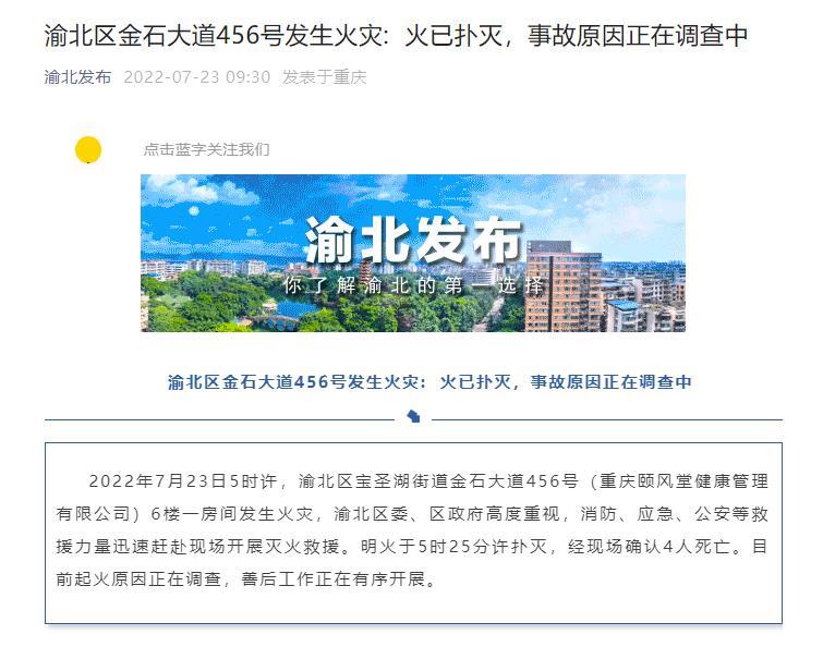 2022年7月23日5时许,重庆渝北区宝圣湖街道金石大道456号(重庆颐风堂健康管理有限公司)6楼一房间发生火灾,渝北区委、区政府高度重视,消防、应急、公安等救援力量迅速赶赴现场开展灭火救援。明火于5时25分许扑灭,经现场确认4人死亡。目前起火原因正在调查,善后工作正在有序开展。