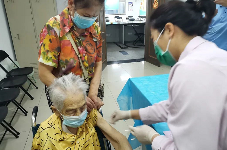 7月22日,一位101岁高龄老人来到海淀区八里庄街道恩济庄社区接种点,接种了新冠病毒疫苗第一针。
