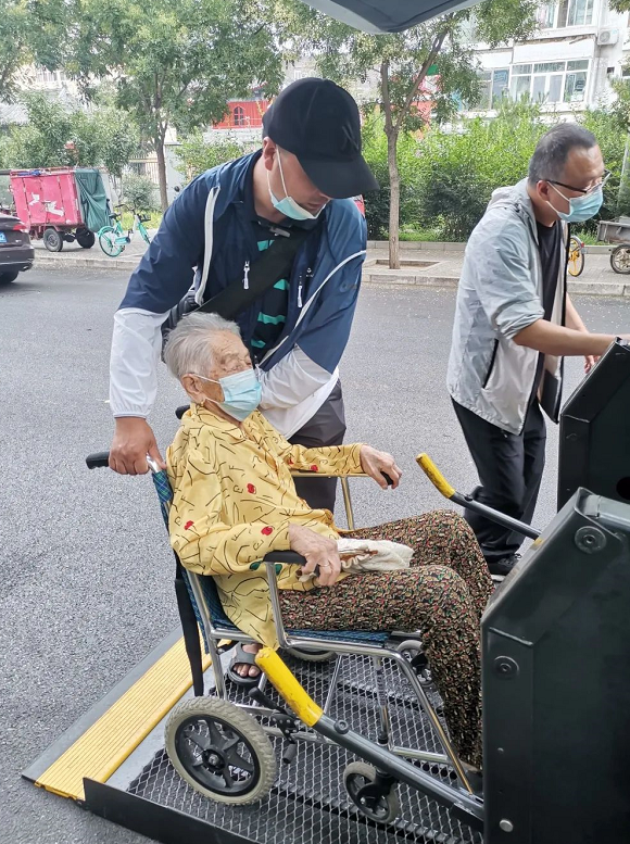 由于老人行动不便需乘坐轮椅,普通交通工具无法将轮椅放置在车内。为保障老人出行安全,街道主动协调无障碍保障车接送老人至永兴花园疫苗点进行接种。