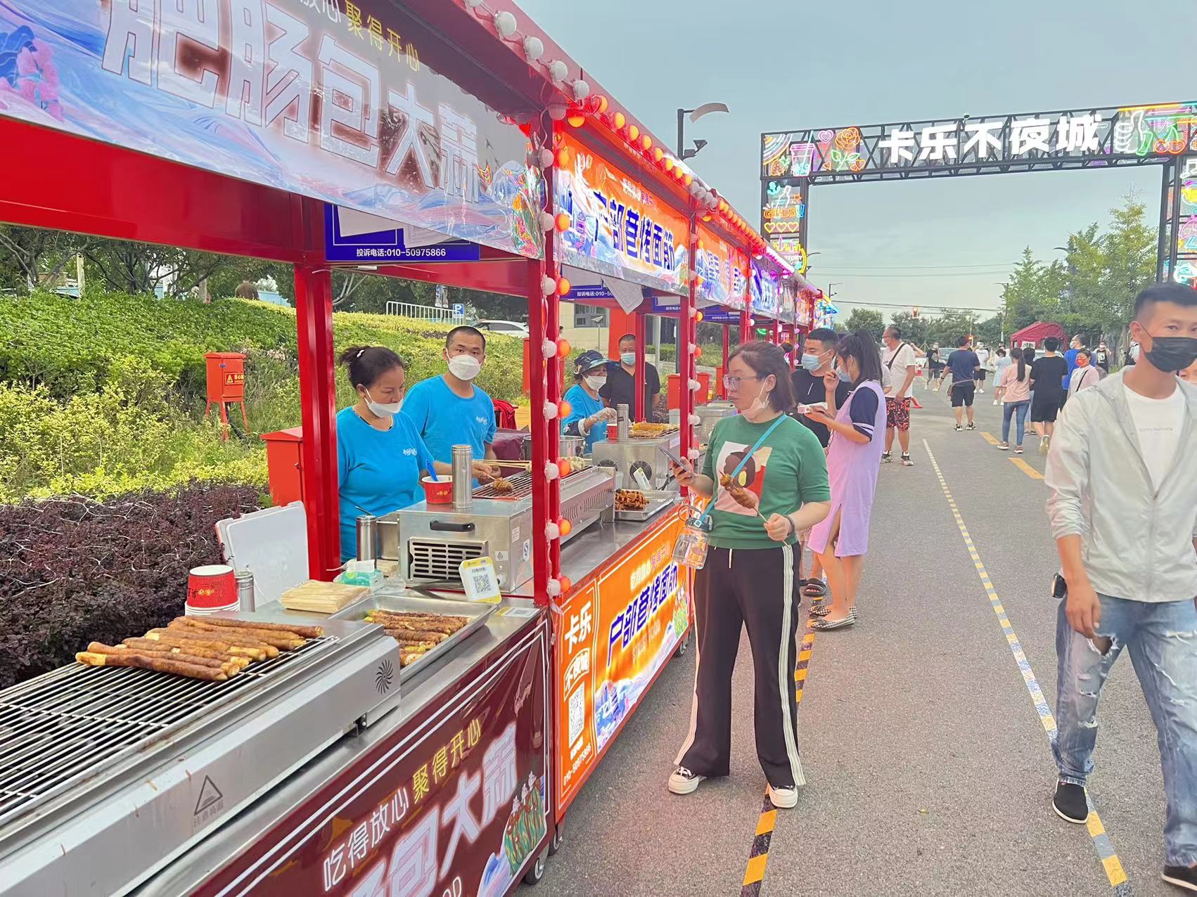 开业当晚,灯光璀璨,夜市的繁华景象落入眼中。晚上7点,不夜城街区开始热闹起来,上百家商户汇聚一起,有精美特色的文创商品和网红饰品,有热火朝天的小吃摊,络绎不绝的市民游客穿梭其中寻觅美食。
