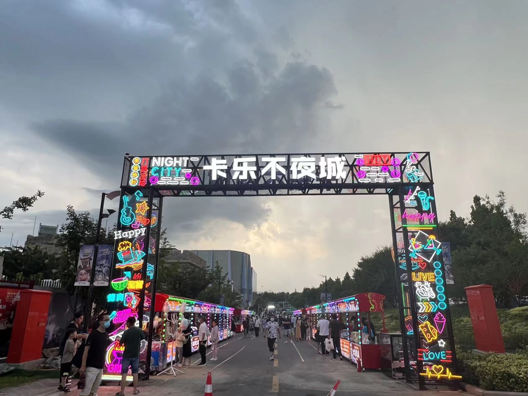 卡乐星球·乐多港不夜城是一个拥有8万平方米的文化休闲体验街区,整体布局分内环、外环,以文创非遗、世界美食、街头艺术为核心,结合露天派对、啤酒狂欢、网红打卡等潮流元素,融合了传统文化和现代时尚氛围。