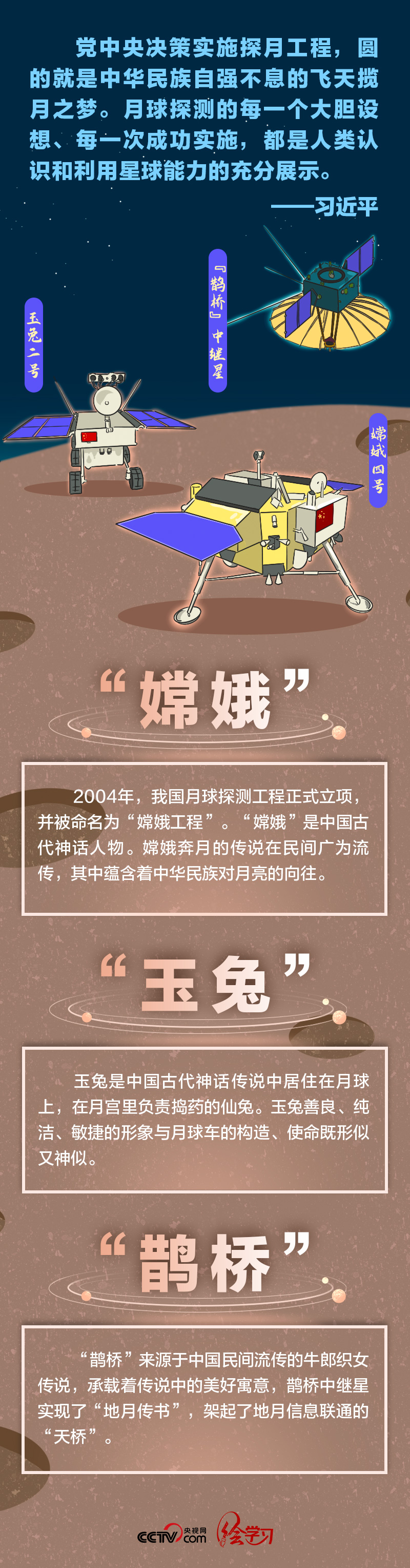 央视网《绘学习》栏目特梳理航天器命名背后的中国传统文化意涵,让我们跟着总书记感受遥远太空的中国式浪漫。