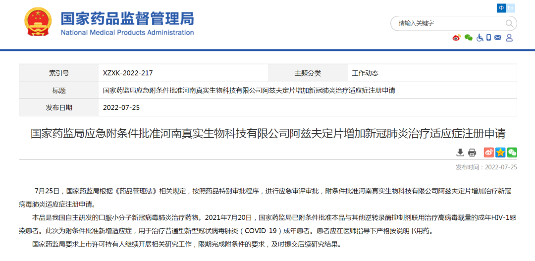 首个国产新冠口服药来了!7月25日晚间,国家药物监督管理局官网显示,河南真实生物科技有限公司的阿兹夫定片增加治疗新冠病毒肺炎适应症注册申请获批。此次为附条件批准新增适应症,用于治疗普通新冠病毒肺炎成年患者。