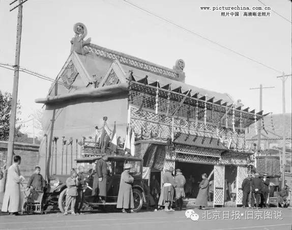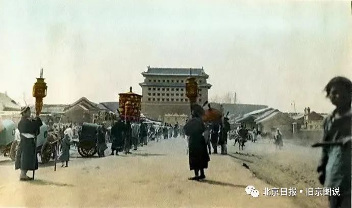 我认为不是因为路祭,主要是照片上既看不到路祭棚也看不到路祭桌,而且如果是路祭,结束的时候要扬大量的纸钱,在照片上是看不到纸钱的。所以我认为照片上送葬的队伍站在那里没走,不是因为有人路祭,而是死者本家在安定门里与不准备去墓地的亲友致谢告别。