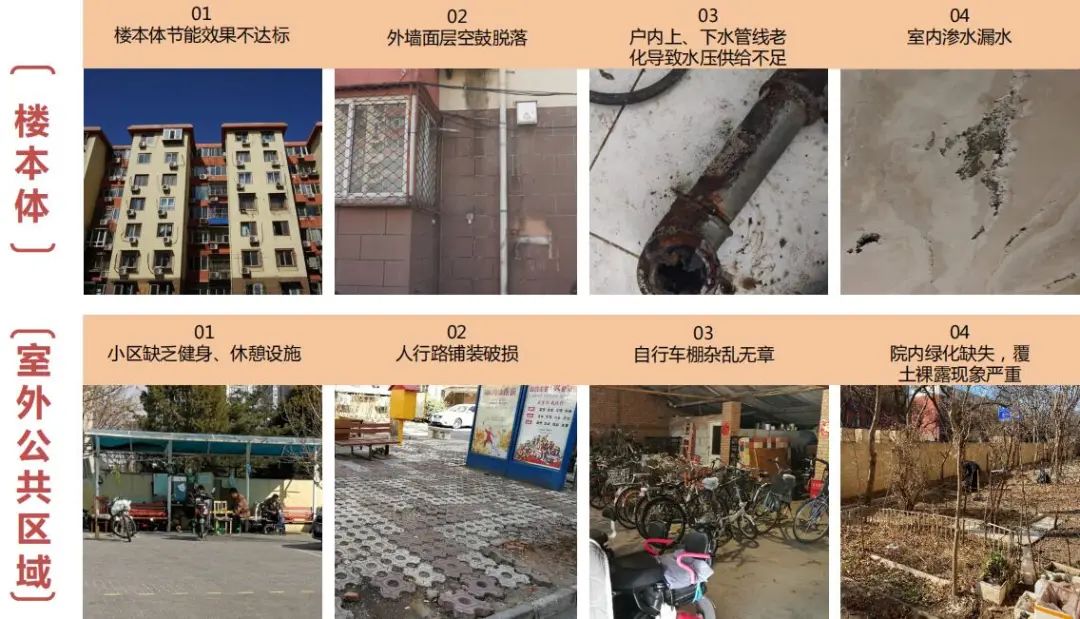 作为典型的老旧小区,八角北路11号院小区目前主要存在楼本体节能不达标,墙面破损渗水、楼内上下水管道年久失修、人行路铺装破损、小区缺乏健身及休憩设施、绿化缺失覆土裸露现象严重、环境品质低、架空飞线凌乱、配套服务设施不足等问题。